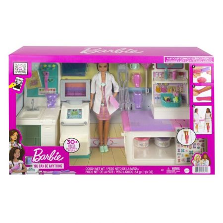 Objevte svět pečovatelství s herní sadou Barbie® Klinika 1. pomoci s lékařskou! Když si dívky hrají s Barbie®, představují si, čím vším se mohou stát, a ty, které rády pečují o ostatní, mohou provozovat kliniku 1. pomoci! Klinika obsahuje lekařku Barbie® brunetku (30,4 cm) a 4 hrací plochy: ordinaci, vyšetřovací stůl, rentgenový přístroj a dárkový obchod. Děti mohou vyrábět sádru pro své panenky „pacienty“ (prodávají se samostatně), která je realistická (použijte růžovou, nachovou nebo bílou hmotu), a to na paže a nohy pacientů, a pomocí nástroje zafačovat postižená místa. Herní sada obsahuje také 30+ doplňků k obohacení hry: 3 nádoby s hmotou, sádra na nohu, sádra na paži Chelsea®, sada berlí, nálepky, rentgen, zboží z dárkového obchodu a další. Některé doplňky jsou vybaveny sponkou, aby je Barbie® lékařka mohla uchopit a hra s ní byla ještě realističtější! Děti si zamilují nekonečné možnosti tvůrčího vyjádření a zábavy při vyprávění příběhů! Panenka nemůže stát sama. Barvy a vzhled se mohou lišit. Sada představuje ideální dárek pro děti od 3 let.