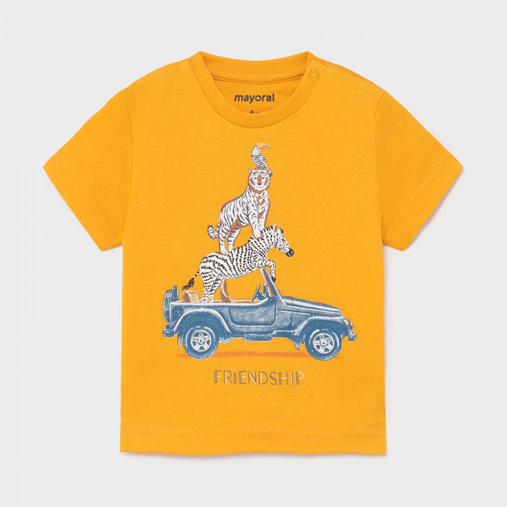 Mayoral chlapecké triko s krátkým rukávem. Kulatý výstřih, zapínání u krku pomocí jednoho druku. Vepředu zábavný obrázek se zvířátky. Vyrobeno z Ecofriends bavlny, šetrné při výrobě k životnímu prostředí.