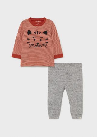 Mayoral dětská domácí souprava trička s dlouhým rukávem a kalhot v úložném pytlíku. Vhodná i jako pyžámko. Tričko v pruhovaném designu, s kulatým výstřihem, zapínáním pomocí druků u krku, zdobeno obrázkem tygříka. Kalhoty v pase elastické, v dolní části mají elastické manžety.
