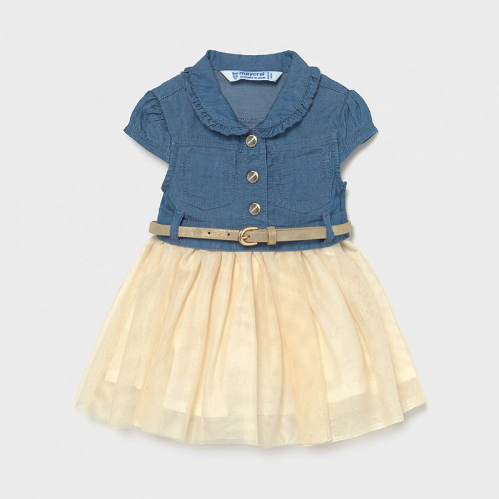 Mayoral dívčí kombinované šaty s krátkým rukávem a elastickým pasem. Jako doplněk slouží pásek. Šaty mají širší kombinovanou sukni. Zapínání vepředu pomocí druků. Šaty mají v přední vrchní části kapsy.