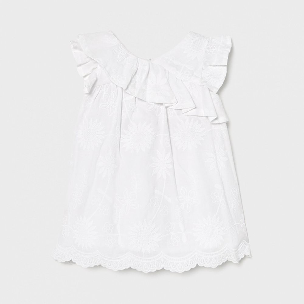Mayoral dívčí šaty na ramena s volánky. Zapínání vzadu pomocí zipu. Šaty mají vyšívaná vzor. Na spodní straně je našitá krajka.