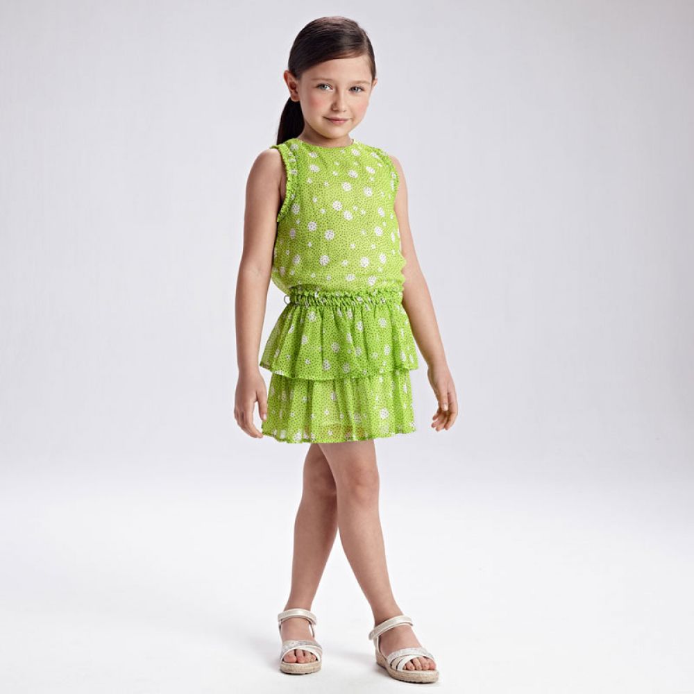 Mayoral dívčí šifonové šaty. Lehký vzdušný materiál. Puntíkovaný vzor. Ve spodní části volánky. Vzadu zapínání pomocí knoflíku.   Materiál - 100 % polyester, uvnitř 100 % viskoza ...více informací
