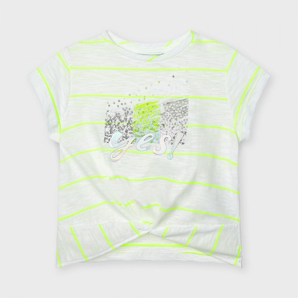 Mayoral dívčí tričko s krátkým rukávem. Kulatý výstřih, pruhovaný vzor. V přední části zdobeno nápisem a flitry. Vyrobeno z bavlněného materiálu. Ve spodní části dekorativní uzlík.