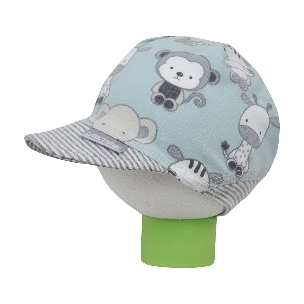 Kojenecká bavlněná kšiltovka ve světlé mint barvě s motivem zvířátek. Střih je hlubší, kryje ouška, kšiltík chrání před sluníčkem.