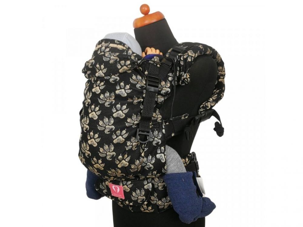 - manipulace - před prvním použití si nastavíte potřebnou šířku středového panelu (zádové opěrky). Bederní pás si zapnete pomocí přezky. Miminko si dáte na hrudník čelem k sobě s roztaženýma nožičkama. Přetáhněte přes miminko středový panel, nasaďte ramenní popruhy, zajistěte a dotáhněte. Větším dětem lze také při nošení vepředu i na zádech zajistit při spaní hlavičku pomocí kapucky k tomu určené.