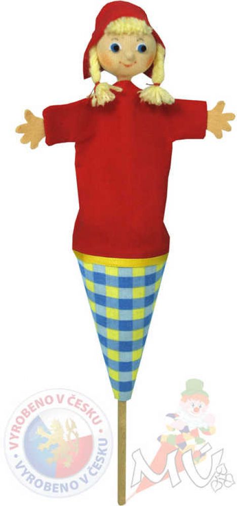 Velký maňásek v kornoutu Červená Karkulka, textilní, ovládaný dřevěnou tyčinkou pro hraní maňáskového divadla udělá radost všem dětem. Můžou si zahrát svou oblíbenou pohádku.