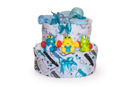 Recenze NašeMimčo Dvoupatrový plenkový dort modrý se žabkami Základ z plen: Pampers Premium Care vel. 1 (2-5 kg)