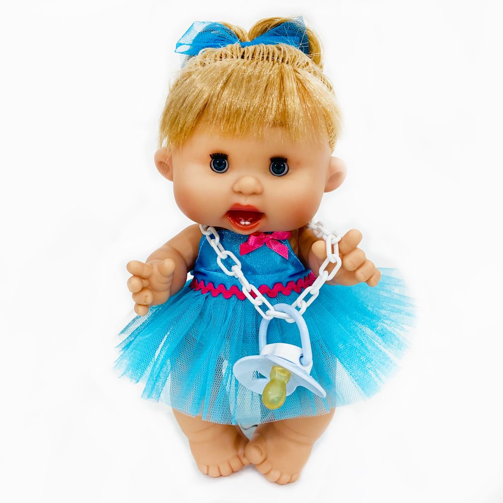 Ručně vyrobené mrkací miminko, plaváček, holčička je vyrobena z vinylu, má vlásky po celé hlavě a lze se koupat. Má mrkací oči. Velikost miminka je 26 cm. Krásné miminko holčička, plaváček, je vyrobena do nejjemnějších detailů a má pohlaví. Miminko má na sobě šatičky a kalhotky. Součástí je dudlík. Panenka má velikost 26 cm. Miminko jemně a trvale voní a je vyrobeno ve Španělsku. Baleno v krásném vaku, který lze využít jako batůžek.