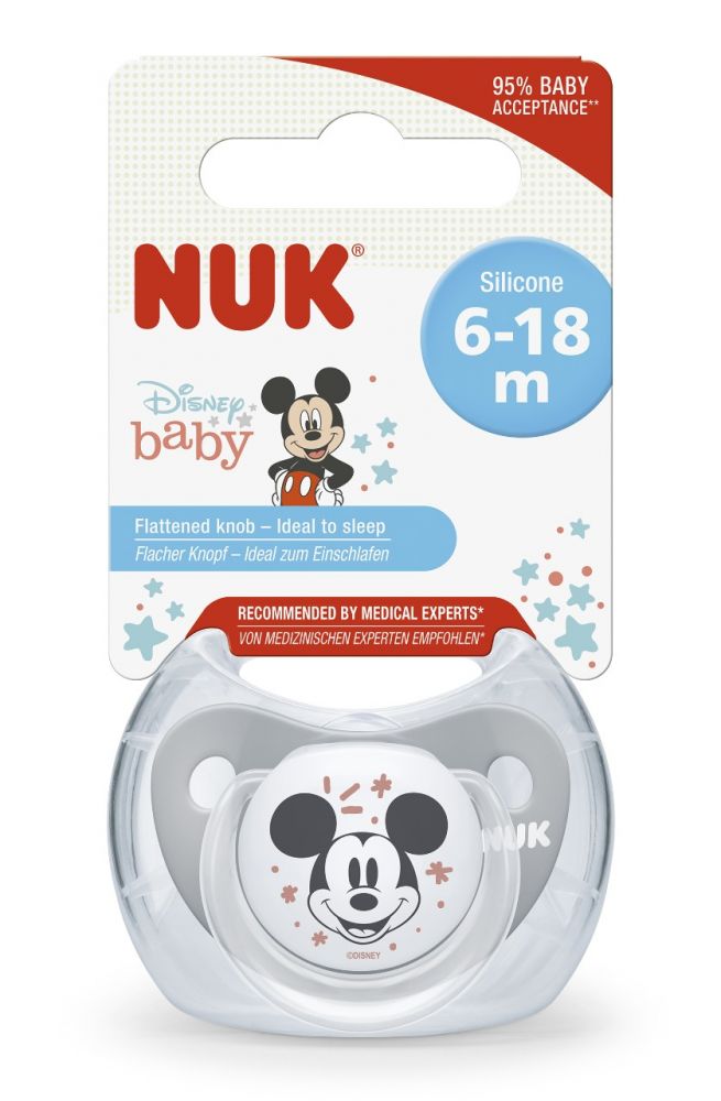 NUK silikonový dudlík s Disney motivem pro správný vývoj ústní dutiny dítěte • Ortodontický tvar dudlíku NUK – dudlík má stejný tvar jako matčina bradavka při kojení, dokonale padne do úst dítěte při sání• Díky užšímu a ploššímu tvaru sací části se snižuje tlak na zuby a čelisti• Plochá sací část a hladká spodní strana přinášejí dítěti příjemný pocit a podporují tak přirozené sání• Dudlík NUK má navíc svou vlastní praktickou krabičku. Ta se postará o hygienické čištění dudlíku v mikrovlnné troubě, cestování i skladování v čistotě a bezpečí.• bez BPA, 1 ks v balení Dudlíky NUK jsou díky svému trendy designu skvělým módním doplňkem, který udělá z vašich malých objevitelů módní ikony. Anatomicky tvarovaná vnější část dudlíku nezpůsobuje otlačeniny, a proto je dudlík ideální pro pohodlné usínání na boku i na břiše. Průhledný silikon se snadno čistí, je chuťově neutrální, bez zápachu a je odolný vůči vysokým teplotám. Neobsahuje škodlivé látky, je odolný při vyváření a má hladký povrch. Všechny dudlíky NUK mají NUK Air System, který umožňuje únik vzduchu ze savičky, aby jej dítě nepolykalo. Díky tomuto systému zůstává dudlík měkký a snadno se přizpůsobí dětským ústům. Protože je pro nás celkový vývoj dítěte velmi důležitý, chceme, aby každý dudlík značky NUK podpořil přirozený a zdravý vývoj dětské čelisti. Dudlíky NUK jsou na základě nejnovějších lékařských poznatků uzpůsobeny tak, aby dítě uklidnily ještě lépe než kdy dřív, čehož jsme dosáhli díky tvaru, který je dítěti velmi dobře známý. Kojící matky potvrzují, že používání dudlíků NUK kojení nijak neovlivňuje*. Maminky tak mají více času na odpočinek. Kromě toho používání dudlíků NUK nezpůsobuje žádné ortodontické potíže, jako např. křivé zuby či deformaci čelisti. Plochý a úzký tvar sací části dudlíku minimalizuje tlak na zuby i čelist a nechává v ústech spoustu místa pro jazyk, a tedy i pro přirozené sací pohyby. Díky tomu jsou dudlíky NUK vysoce hodnocené a doporučované porodními asistentkami, pediatry i ortodontisty. Výsledky testů mluví i ve prospěch nového typu dudlíku NUK: 100 % oslovených ortodontistů potvrzuje, že nezpůsobuje žádné potíže**, 95 % dětí tento dudlík rychle přijme*, 90 % maminek jeho používání doporučuje* a 92 % kojících matek potvrzuje, že používání dudlíku kojení nijak neovlivňuje. * Nezávislý průzkum trhu, 307 oslovených matek, Německo 2017 ** Nezávislý průzkum trhu, osloveno 50 ortodontistů, 50 pediatrů a 50 porodních asistentek, Německo 2017