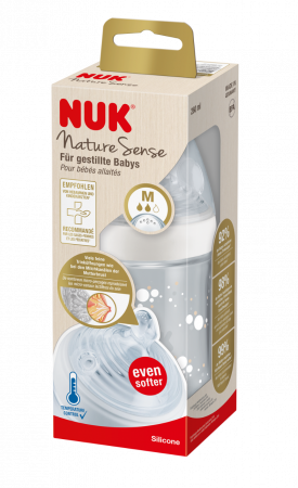 Plynulý a přirozený průtok několika malinkými otvory, které velikostí odpovídají mléčným kanálkům v matčině prsu Široká a flexibilní opora pro rty a extra měkká špička savičky podobná matčině bradavce pro ten nejpřirozenější pocit sání jako z matčina prsu – a nyní ještě měkčí Zabudovaný indikátor kontroly teploty změní barvu, pokud je obsah láhve příliš horký. Modrá barva indikátoru se změní na bílou Velikost M s 6 otvory na pití (pro střední průtok) Kojenecká láhev z vysoce kvalitního polypropylenu (PP), objem 260 ml, neobsahuje BPA Kojenecká láhev NUK Nature Sense: známý pocit, který vaše děťátko miluje Maminko, jste nejlepší! Pro vaše miminko jste nenahraditelná. Díky kojenecké láhvi NUK Nature Sense má vaše maličké pocit, že pije z matčina prsu. To nám „potvrdilo“ přes 90 % miminek – ne pomocí slov, ale tím, že láhev NUK Nature Sense ihned přijaly a bez problémů snáší střídání mezi pitím z láhve a kojením. Nepostradatelná pomoc pro maminky, které si zaslouží odpočinek, pro tatínky, kteří by také chtěli nakrmit své miminko, a pro chvíle, kdy je čas miminko odstavit. Tohoto jedinečného přirozeného pocitu je dosaženo díky savičce, jejíž tvar je vymodelován podle matčiny bradavky. Do posledního detailu. Savička láhve NUK Nature Sense je vybavena několika malinkými otvory, které připomínají mléčné kanálky v matčině prsu. Tyto otvory zajišťují optimální, rovnoměrný a přirozený průtok. Tvar savičky rovněž připomíná tvar ženské bradavky při kojení. Během krmení se přizpůsobuje jazyku a patru miminka. Savička NUK Nature Sense tento jedinečný tvar napodobuje. Měkký materiál pro známý pocit během krmení. * Nezávislý průzkum trhu, Německo 2016 NUK Nature Sense s kontrolou teploty To je dobrý pocit! Když nastane shon a zmatek, je dobré vědět, že nejste na všechno sama. Kojenecká láhev NUK Nature Sense s kontrolou teploty ukáže, kdy má výživa tu správnou teplotu. Díky funkci kontroly teploty mění stupnice na láhvi barvu v závislosti na teplotě obsahu. Pokud je obsah příliš horký, modrá barva indikátoru se změní na bílou. Pozor: NUK kontrola teploty je určena pro dodatečnou kontrolu. Před krmením je teplotu nutné zkontrolovat i ručně. Chcete-li zkontrolovat teplotu, nakapejte několik kapek obsahu láhve na vnitřní zápěstí. Ta správná savička pro každé miminko Savička je k dispozici se třemi různými otvory na pití (S, M a L). V závislosti na individuální síle sání miminka umožňují tyto různé varianty otvorů optimální průtok příkrmu. NUK Nature Sense – pro pocit přirozeného sání jako z matčina prsu