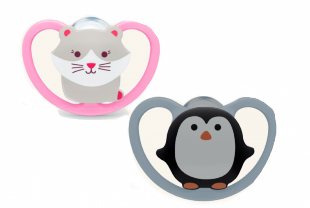 Recenze NUK Silikovoný dudlík Kočička, Tučňák 6-18 m, růžovo/šedý