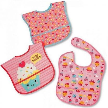 Set tří omyvatelných nepropustných bryndáků na suchý zip s kapsou zamezí ušpinění oblečení při krmení.