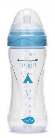 Moci své dítě kojit co nejdéle, je velkým přínosem jak pro matku, tak i pro dítě. V některých případech to však například ze zdravotních důvodů matky nebo dítěte není nadále možné. Proto NUVITA vytvořila inovativní láhve na krmení, které pomáhají vytvářet alternativu mezi prsem a lahví. A to vše přirozenou cestou.Plochá a delší "bradavka" usnadňuje přirozený peristaltický pohyb jazyka. Je vysoce flexibilní a ohebná (360 °). Dutá základna simuluje přirozenou pružnost mateřské bradavky při kojení a zároveň její široká plocha zvyšuje pocit, že je děťátko v kontaktu s prsem matky. Její povrch je vyvinut tak, aby simuloval skutečnou bradavku. Ergonomický tvar láhve umožňuje snadný úchop pro děťátko. Maminky potěší ergonomický design otvíracího systému otevírání jedním prstem.Systém "Colic reduction" zajišťuje, že se vzduch vcházející do láhve nemíchá s mlékem. Dítě tak může spokojeně sát bez polykání vzduchu. Objem láhve je 330 ml. Vhodné pro děti věkové kategorie 3m+