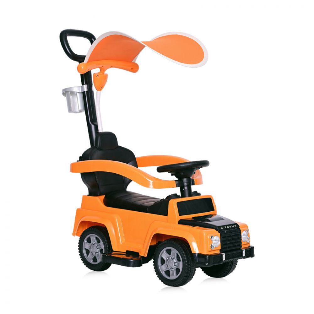 Zábavné odrážecí auto Lorelli X-TREME + Vodicí tyčí + Baldachýn je skvělá praktická hračka pro děti. Přední část auta má zabudovaný hudební panel, který hraje 3 oblíbené dětské melodie. Odrážedlo dělá i další zvuky a světelné efekty, které děti baví. Nechybí ani volant, který je nezbytný pro každé správné auto. Podporu dětí při jízdě zajišťuje nejen pohodlná opěrka, ale i ochrana kolem dítěte, která mu umožní držet stabilitu během jízdy a při zatáčení. Nápomocné jsou i nožní opěrky, které jsou pro potřeby odstrkovadla také odnímatelné. Odrážedlo má v sobě zabudované i praktické držátko na pití. Skvělý je také úložný prostor na hračku pod sedačkou odrážedla. Pro ochranu před sluníčkem je také zabudované stínítko, které chrání dítě.