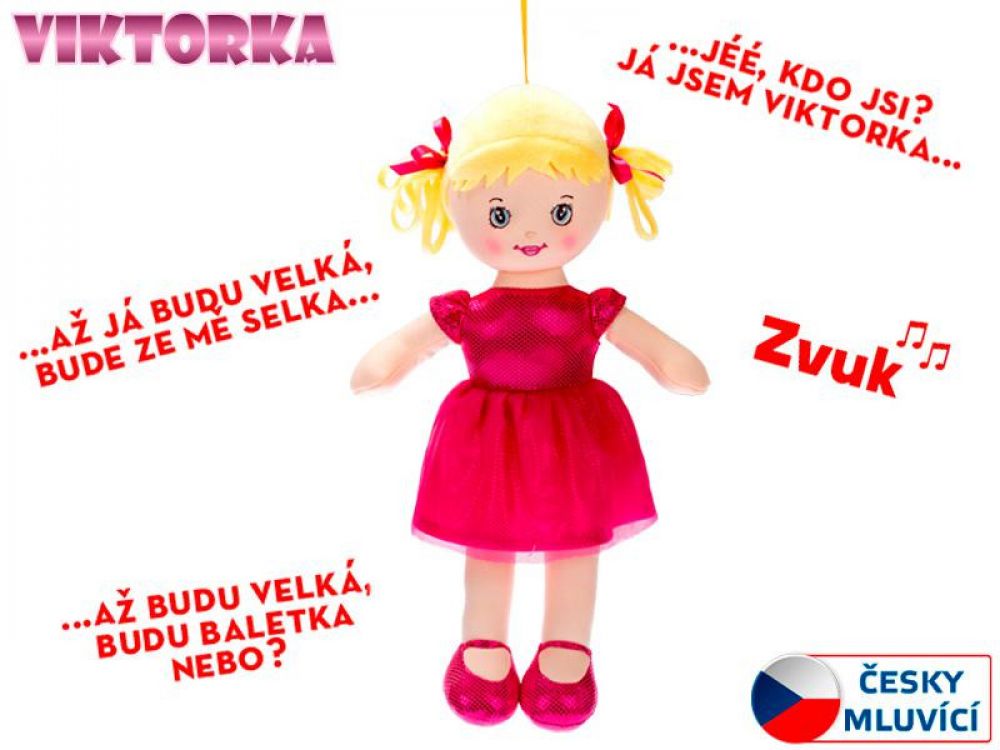 Látková panenka česky mluvící o výšce cca 32 cm. Po zmáčknutí panenka říká a zpívá české písničky a říkanky. Například Až já budu velká, bude ze mě selka nebo Jééé Kdo jsi ty? Já jsem Viktorka Látková panenka česky mluvící o výšce cca 32 cm. Po zmáčknutí panenka říká a zpívá české písničky a říkanky. Například Až já budu velká, bude ze mě selka nebo Jééé Kdo jsi ty? Já jsem Viktorka