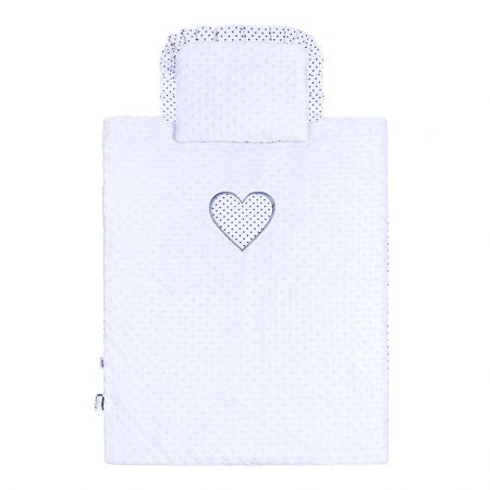 Oboustranný set z Minky New Baby do kočárku. Z jedné strany je minky materiál a z druhé strany bavlněná látka celopotištěná puntíky. Set obsahuje polštářek, který je ozdoben volánkem, a přikrývku, která má na straně minky našité krásné velké puntíkové srdíčko. Klademe důraz na kvalitu a proto jsou peřinky do kočárku ušity z velmi kvalitního materiálu, který nepouští barvu, a nevyvolává alergické reakce. Vše je vyplněno antialergickým vláknem. Složení: povlak 100% bavlna, 100% polyester, výplň 100% polyester. Rozměry: polštářek: cca 25x32 cm, peřinka: cca 82x68 cm. Tyto výrobky jsou bezpečné, protože:-přírodní bavlna nezpůsobuje odřeniny a podráždění, jelikož neobsahuje formaldehydy a další prvky, které kojencům škodí- neztrácí barvu a nezabarvuje oblečení- nabízené vzory jsou příjemné na pohled a mají uklidňující barvy- nejsou použity žádné knoflíky ani žádné další plastové nebo ocelové části, které mohou být pro Vaše dítě nebezpečné- materiál, který je používán pro výplně polštářů a přikrývek, je 100% protialergický, což znamená, že se v jeho vláknech nešíří žádné mikroorganismy ani plíseň