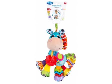 Playgro Koník Klusáček Měkký textilní koník je to nejlepší, co svému miminku můžete dopřát. Je vyroben z pestře vzorovaných materiálů, které působí příznivě v rozvoji dětského zraku. Rozmanité struktury materiálů stimulují dětský hmat. Koníkovi tlapičky šustí a v jedné nožce je ukryta řachtací kulička. Na krku má pověšené kousátko, které uleví od bolesti při prořezávání zoubků. Hračka je opatřena závěsným klipem, kterým je možné hračku zavěsit na postýlku, kočárek nebo autosedačku. Vhodné od 0+. Čištění: Hračku pouze ručně omývat navlhčeným hadříkem.