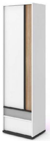 Policová šatní skříň. Rozměry: šířka 55 cm, výška 198 cm, hloubka 40 cm. Praktická policová skříň s výsuvnými zásuvkami nesmí chybět v žádném pokoji. Pomůže udržet pořádek a přehled v oblečení, do spodních zásuvek lze utřídit menší textil, např. spodní prádlo, ponožky a další doplňky.