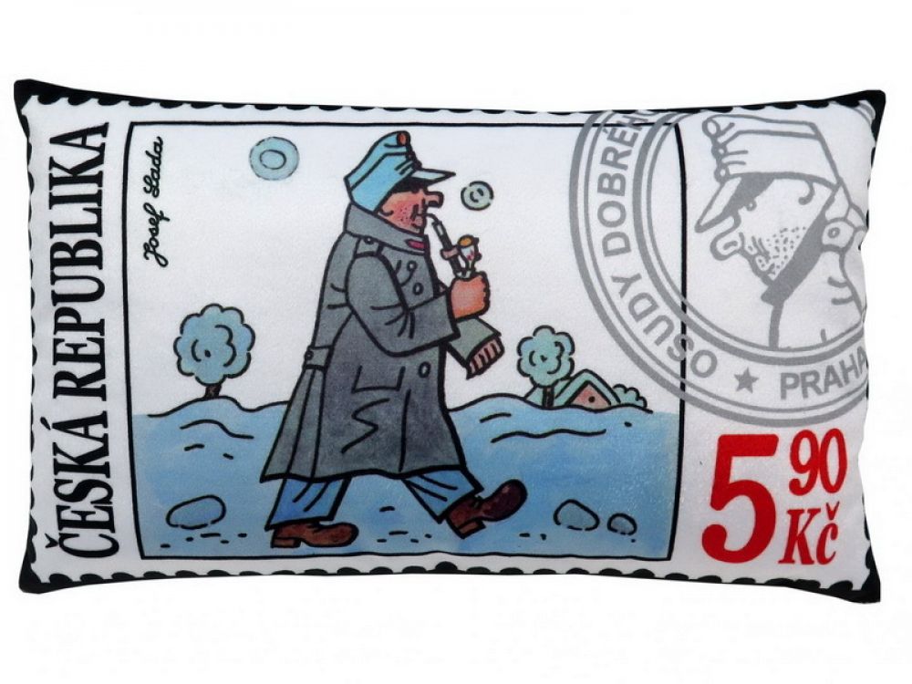 Měkký polštářek s motivem dobrého vojáka Švejka od Josefa Lady, vhodný na cesty i jako dekorace. Materiál mikrovelur, obrázek tisk, náplň duté vlákno. Pratelný.Praní na 30°C, 100% polyester. Vyrobeno ručně v ČR.