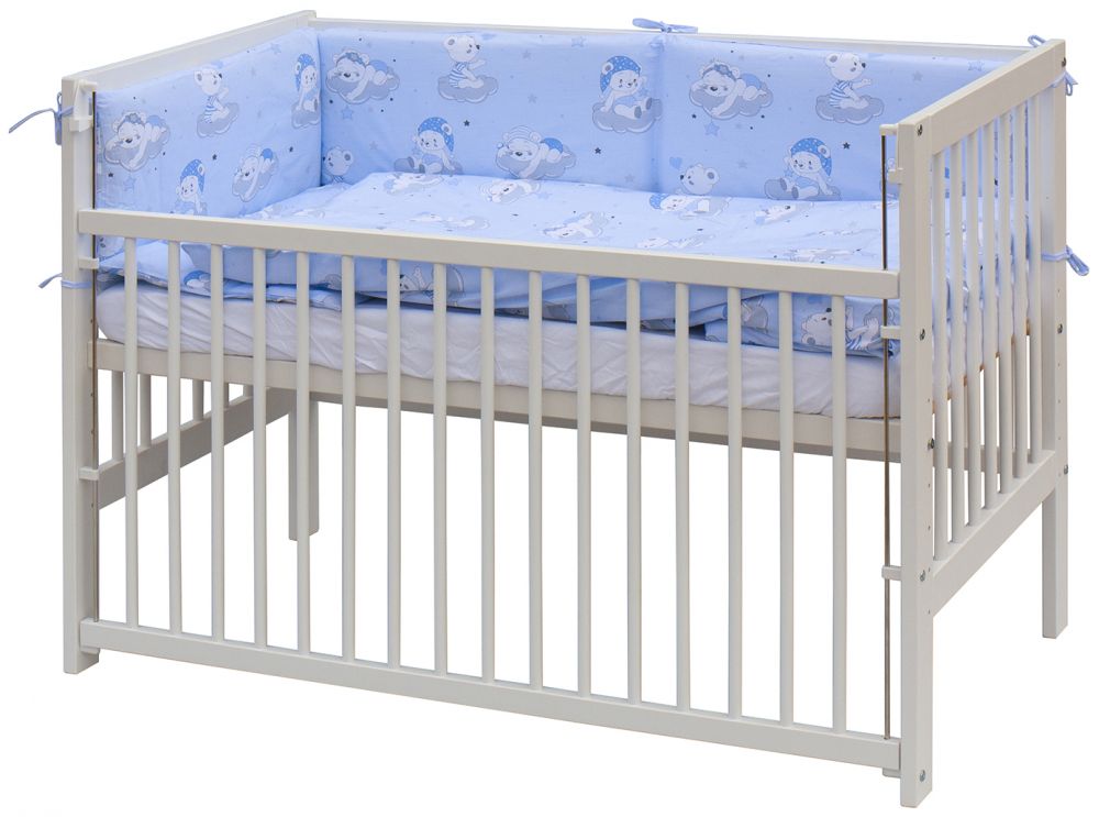 Dětská postýlka s kompletní soupravou povlečení a doplňků Scarlett Tajo Komplet obsahuje1. Dětská dřevěná postýlka 120x60 cm - bílá, masiv buk, stahovací bok, 6 poloh roštu, nohy jsou předvrtané pro možné nasazení koleček2. Matrace 120x60x6 cm, PUR pěna, potah bavlna3. Potah na peřinku 135 x 100 cm - 100% bavlna4. Potah na polštářek 60x40 cm - 100% bavlna5. Výplň peřinky 135 x 100 cm - polyester, potah 100% bavlna6. Výplň polštářku 60x40 cm - polyester, potah 100% bavlna7. Ochranný límec 180x30 cm - potah 100% bavlna, výplň polyester8. Prostěradlo froté 120x60 cm - 100% bavlna