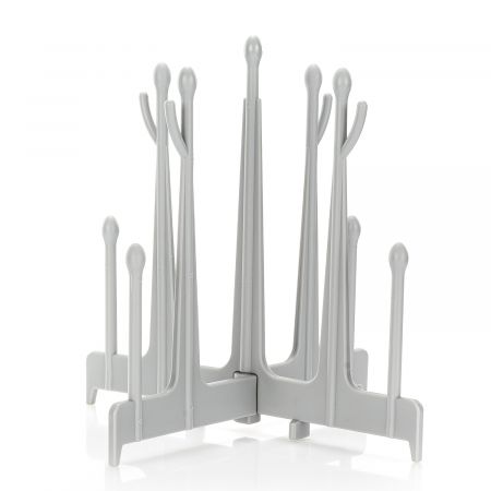 Stojan na kojenecké láhve- hygienické sušení kojeneckých lahví a příslušenství- dostatek prostoru díky 9 praktickým sušícím pozicím- pasuje na všechny značky a velikosti kojeneckých lahví- lze složit a uložit velmi kompaktně, takže ideální na cesty- barva: šedá- rozměry: 23 x 21 cm- materiál: plast, bez BPA a ftalátůPro hygienicky čisté lahve atd.Hygiena je zvláště důležitá pro novorozence. Děti ještě nemají dostatek protilátek, aby se dostatečně chránily proti patogenům. Z tohoto důvodu mohou láhve nebo savičky, které nebyly řádně vyčištěny, rychle způsobit infekce, bolestivé koliky a žaludeční nebo střevní potíže. Důkladné čištění kojeneckých potřeb je nezbytné.Pomocí sušicího stojanu lze láhve a dudlíky po čištění sušit a skladovat zvláště hygienickým způsobem.Hygienické sušení speciálně pro kojenecké potřebySe speciálním sušícím stojanem na kojenecké láhve je pracné sušení minulostí. Dětské potřeby lze nechat okapat na stojanu ihned po vyčištění a uložit je tam do dalšího použití nebo do dezinfekce ve sterilizátoru. Obzvláště hygienické: dětské potřeby se suší odděleně, mimo jiné kusy nádobí a skleněného nádobí, a je také důsledně zabráněno kontaktu s odkapávací deskou dřezu, kde mohou působit bakterie.Spousta místa s 9 polohami sušeníStojan je vybaven 9 různými polohami sušení. To umožňuje současné sušení několika lahví. Otevřený design umožňuje nejen použití pro kojenecké láhve všech značek a velikostí, ale také zaručuje dobrou cirkulaci vzduchu i při plném naplnění – pro rychlé sušení lahviček.Flexibilní použití vhodné i jako příslušenstvíDůkladné čištění znamená řešit nejen lahvičky, ale také atrapy, víčka, savičky a kousací kroužky. S ohledem na to má stojan na láhve další ramena na straně. Ty lze použít pro zavěšení dudlíků nebo dudlíků s kroužky. Jsou dokonce vhodné pro sušení nástavců nebo hadiček na odsávání mateřského mléka.Praktický design skládacíPokud byste stojan někdy nepotřebovali, jeho skládací konstrukce jej umožňuje jednoduše složit naplocho a dokonce i uložit do plochých zásuvek. Jeho malé rozměry znamenají, že jej lze umístit i do zavazadla a využít tak na dovolené.Vysoce kvalitní materiál pro dlouhé a bezpečné používáníAby bylo zajištěno hygienické sušení lahví po dlouhou dobu, je nezbytné pravidelné čištění stojanu. Pro snadné čištění, které stále zaručuje použití bez bakterií, byl stojan vyroben z plastu vhodného do myčky nádobí. Vysoce kvalitní materiál neobsahuje nebezpečné a škodlivé látky, jako jsou BPA a ftaláty, takže je 100% bezpečný pro kontakt s dětskými předměty.