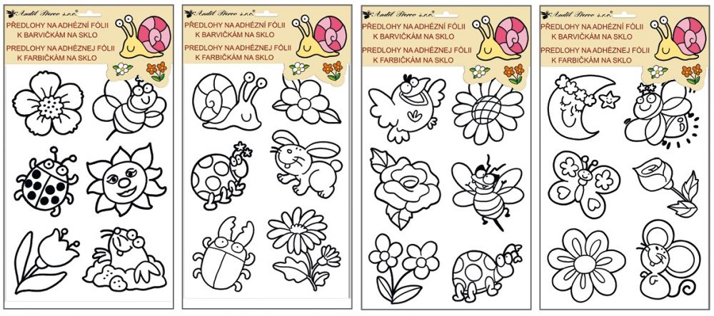 Předlohy na malování na sklo s vyvýšenou konturou květiny 37x21cm PŘEDLOHA S VYVÝŠENOU KONTUROU. ADHÉZNÍ FÓLIE ELEKTROSTATICKY PŘILNE K POVRCHU! Vybarvěte a po uschnutí umístěte na čisté, případně navlhčené sklo, zrcadlo, apod... Můžete vybarvit: barvičkami na sklo, fixami, vodovými barvami apod.