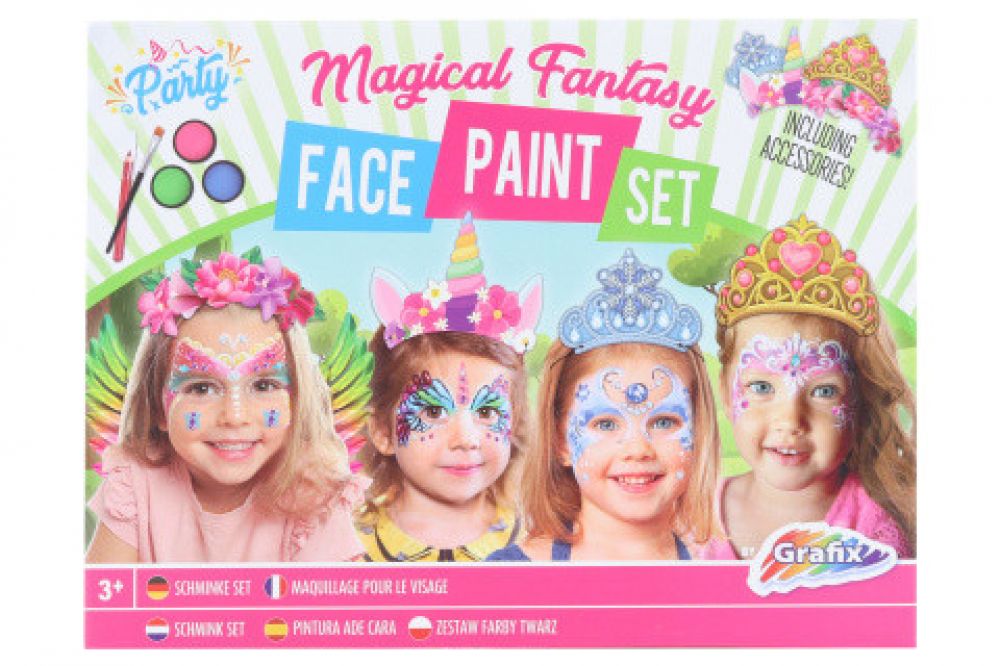 Sada obsahuje 7 barev na obličej, 2 štětečky, 2 tužky, šablony, třpytky, 2 nanášecí houbičky, kartonové korunky a gumička. Rozměr balení cca 23 x 30,5 x 5 cm. Sada obsahuje 7 barev na obličej, 2 štětečky, 2 tužky, šablony, třpytky, 2 nanášecí houbičky, kartonové korunky a gumička. Rozměr balení cca 23 x 30,5 x 5 cm. Vhodné pro děti od 3 let.
