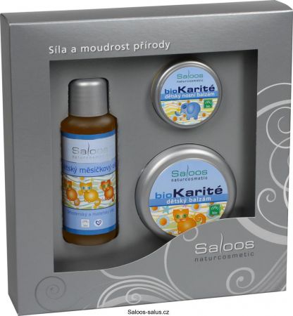 Růžové máslo tělo & obličej Bio 75ml Dárková kazeta Dětská - pro každodenní péči obsahuje:Bio tělový a masážní olej- Dětský měsíčkový olej 50 ml- účinně pečuje o citlivou a jemnou pokožku miminka, chrání ji před vysoušením a podrážděním. Zklidňuje a hojí červená, bolestivě vypadající místa a opruzeniny v oblasti plenek. Doporučujeme ke každodennímu ošetření pokožky celého tělíčka, zejména po koupání. Léčivý extrakt z měsíčku lékařského v harmonické kombinaci s mandlovým a pupálkovým olejem v bio kvalitě vyhovuje jemné pokožce dětí a novorozenců od prvních dnů života.Bio Karité- Dětský balzám 50 ml- nejjemnější složení bio bambuckého másla spolu s bio oleji jsou tím nejlepším pro jemnou a citlivou pokožku dětí a miminek již od prvních měsíců života. Harmonické spojení levandule, heřmánku a geránie působí antisepticky, vyživuje a zklidňuje zanícenou pleť a chrání ji před vnějšími vlivy prostředí. Dětský balzám je skutečným pohlazením, zcela odpovídá potřebám citlivé dětské pokožky. Čistý přírodní produkt v biokvalitě.Bio Karité balzám- Dětský nosní 19 ml- vaše dítě si zaslouží tu nejjemnější péči, což v období nemoci nebo nachlazení platí dvojnásob. Harmonicky vyvážené složení balzámu uvolňuje dýchací cesty, usnadňuje dýchání a přináší okamžitou úlevu. Obsažený esenciální olej z heřmánku zklidňuje bolavý nosík a jeho jemná vůně, dětem tolik příjemná, pozitivně ovlivňuje dětskou psychiku i celkový průběh nemoci. Čistý přírodní produkt v biokvalitě.Ryze česká značka Saloos se od roku 1993 vypracovala na největšího českého výrobce certifikované aromaterapeutické biokosmetiky. Jako první v ČR dokázala splnit velmi náročné podmínky certifikace a od roku 2007 se pyšní ochrannou známkou CPK bio. Cílem značky Saloos je vývoj výrobků v nejvyšší biokvalitě, které přispějí k dokonalé péči o pokožku celého těla i k harmonizaci duše.