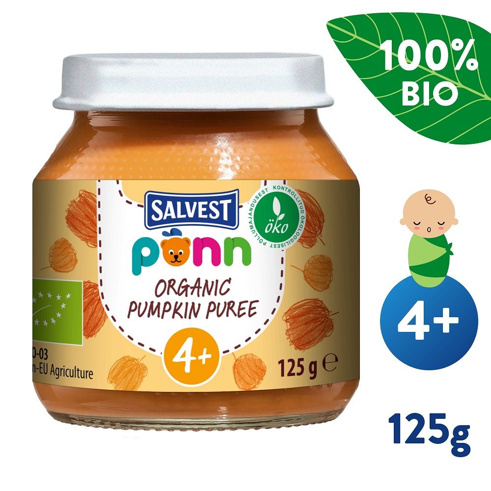 SALVEST Põnn BIO Dýňové pyré (125 g) Složení: *dýně (85 %), voda, *řepkový olej (0,5 %). * V BIO kvalitě. Bez lepku. Výživové údaje na 100 g: energie 160 kJ / 38 kcal, tuk 0,6 g, z toho nasycené mastné kyseliny 0,1 g, sacharidy 6,6 g, z toho cukry 4,4 g (obsahuje přirozeně se vyskytující cukry), bílkoviny 0,8 g, sůl 0,09 g (obsah soli je dán přirozeně se vyskytujícím sodíkem v surovinách).