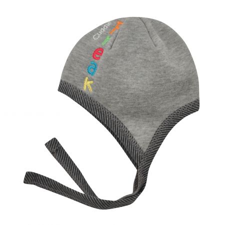Kojenecká bavlněná čepička s tkaničkami na zavazování. Na předním díle výšivka "Cuddle freak" (rošťáček).Vnitřní vrstva bavlny je podčesaná, může docházet ke žmolkování.