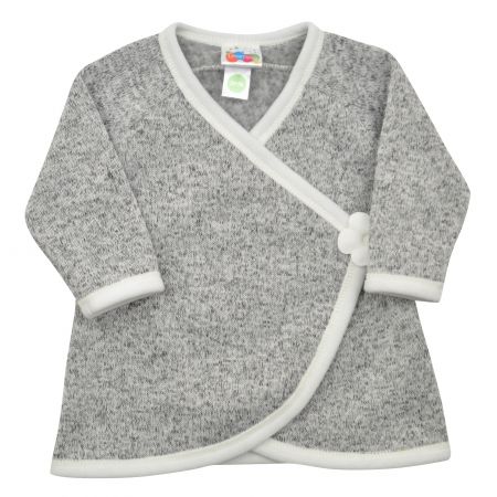 Holčičí zavinovací svetřík z měkké hřejivé svetroviny. Zapínání je na obou bocích na patentky, kabátek se tedy nerozevírá. Viditelný patentek je ozdobený kytičkou. Zavinovací střih je slušivý a praktický i pro malá miminka, protože je nedře u krčku.