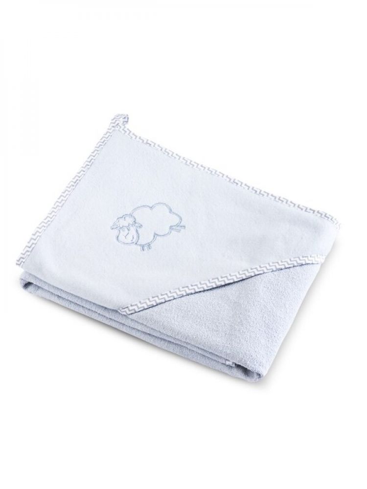 Dětská osuška Sensillo. Na kapuci je vyšívka roztomilé ovečky. Celá osuška je olemovaná barevným lemem se vzorkem. Rozměry: 80x80 cm. Složení: 100% bavlna.