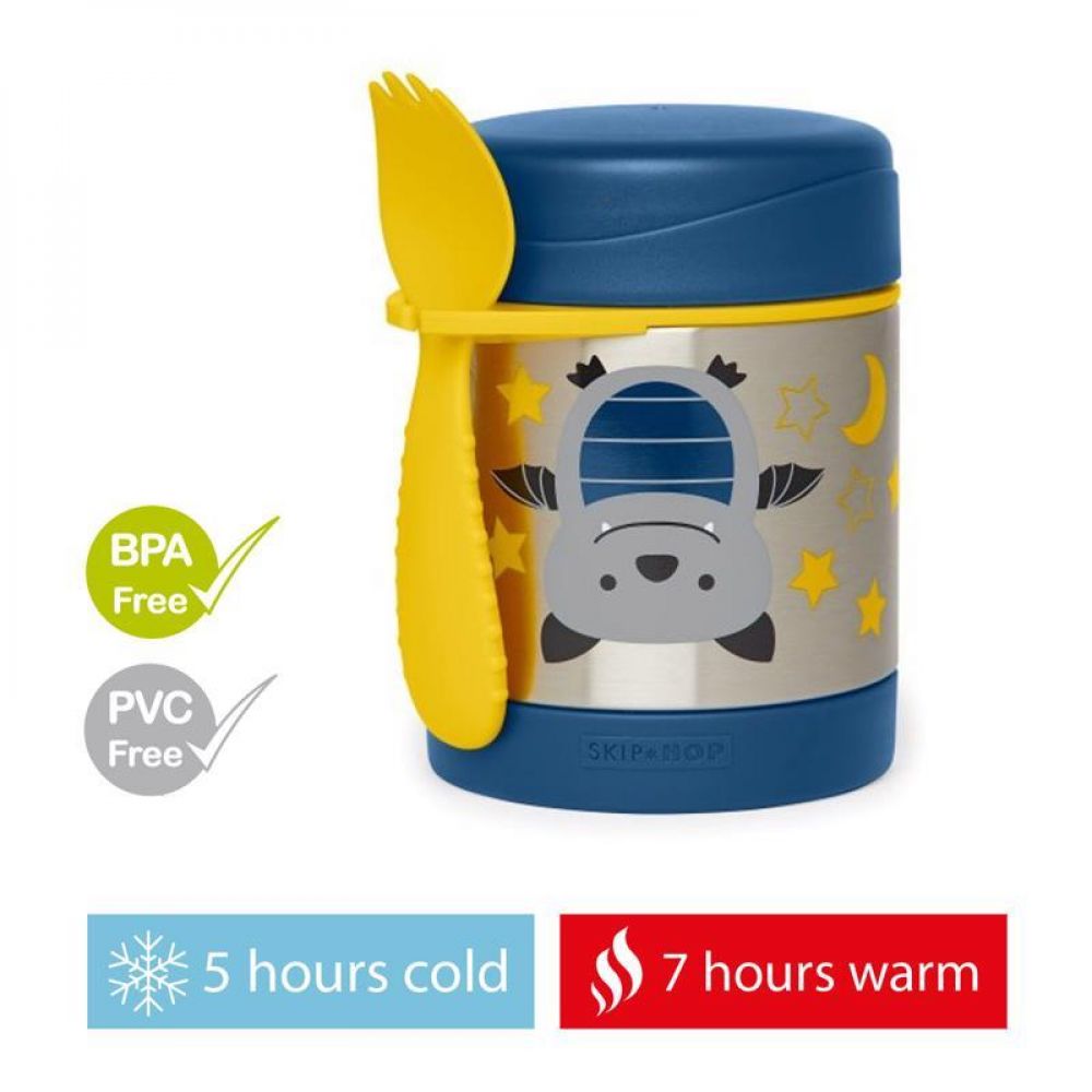 Tato krásná termoska z nerezové oceli s potiskem udrží dětskou porci teplou či studenou. Součástí je praktická vidlička (lžička+vidlička v jednom), kterou lze zavěsit do držátka. Držátko je možné využít i k uložení jiného dětského příboru (obdobného rozměru). Termoska uchová připravený pokrm: teplý až po dobu 7 hodin / a studený až po dobu 5 hodin v závislosti na teplotě připravovaného pokrmu a na venkovní teplotě. Pro lepší výsledek, připravovaný pokrm předehřejte/ochlaďte v teplé/studené vodě po dobu 5ti minut před vložením do termosky. - objem 325ml - bez BPA, bez PVC - bez ftalátů - termoska je z nerezavějící oceli - praktické držadlo na lžičku/vidličku - teplý pokrm vydrží až 7 hodin - studený pokrm vydrží až 5 hodin - možnost sladit s širokou nabídkou produktů značky Skip Hop z kolekce Zoo jako jsou například nerezové láhve s brčkem, nádoby na sušenky až po batůžek do školky. - ve srovnání s konkurencí je součástí balení vidlička / lžička s držákem a moderním dětským motivem. - unikátní design, který si dítě oblíbí a bude více motivované papat z oblíbené termosky na jídlo značky Skip Hop - výrobek splňuje evropské standardy ASTM & EN14372 Rozměry produktu: 9,4 cm x 8,8 cm