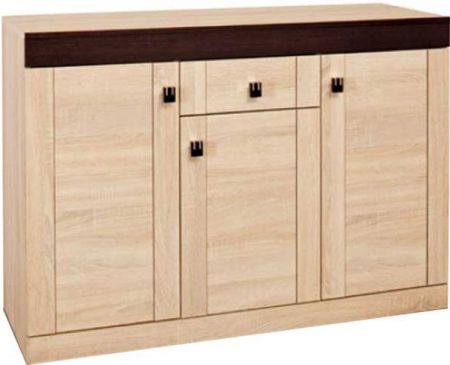 Sektory jsou vyrobeny v dekoru světlého dubu Sonoma s kontrastními vložkami v barvě kaštanu. Úchyty byly také vybrány v kontrastním dekoru wenge, v kombinaci se stříbrem, což dodává nábytku ještě osobitější a jedinečný charakter. Korpus / přední strana: vysoce kvalitní 16 mm laminovaná deska s hranou z PVC. Rukojeti: plast, wenge + stříbro.