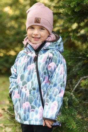 Dětská bunda ze softshellu s delším chloupkem uvnitř.Skvělé parametry membrány - voděodolnost 18000mm/m2, prodyšnost 12000mm/m2/24hod - v kombinaci s hřejivým chloupkem vytvářejí dokonalé podmínky pro to, aby byly děti v zimě chráněné před mrazem a vlezlou vlhkostí.Moderní střih - asymetrické provedení dodává bundě atraktivní vzhled, přitom však zůstává zachována praktičnost. Rukávy jsou zakončeny vnitřními náplety, které nepustí dovnitř zimu ani vlhost. Zip nikde nedře a netlačí, dobře však zajistí šálu nebo nákrčník. A tvarovaná kapucka potěší v nečekané přeháňce:)Originální vzor - motiv lesa laděný do studených zimních odstínů se krásně ladí k jednobarevným věcičkám a skvěle doplní outfity v odstínech růžové, fialkové, modré nebo jakýchkoli neutrálních barev.