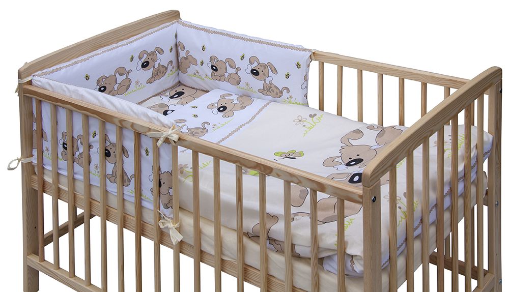 6 dílná souprava obsahuje: povlečení na peřinku 120 x 90 cm povlečení na polštář 60 x 40 cm ochranný límec okolo 1/2 postýlky 3x polštářek do ochranného límce Ochranný límec je prošívaný na 3 části. V každé z částí je nasunutý polštářek. Ve spodní části ochranného límce je zip. Po vyjmutí polštářků je možné límec jednoduše vyprat. Rozměr ochranného límce je 180 x 30 cm.Povlečení je bavlněné a lze jej prát v pračce. Tato souprava lze použít i do postýlky 140 x 70 cm.