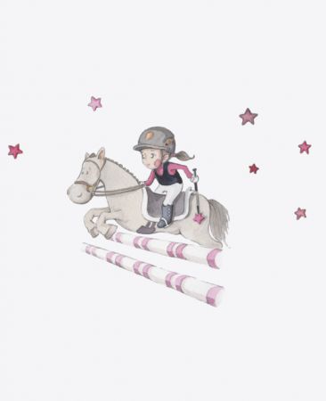 Veselá ručně malovaná akvarelový kresba reprodukce amazonského dívky skákajícího na koni obklopeného růžovými hvězdami. Jedinečný a exkluzivní design Sueños de Cigüeña.Detské vinyly vyrobené z reprodukce použitých malovaných kreseb k dosažení exkluzivního produktu s použitím špičkových materiálů.