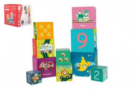 Sada 10 stohovacích kostek, ze kterých si děti mohou postavit věž (pyramidu) vysokou až 111,5 cm i jiné tvary. Kostky jsou z pevného kartonu s krásnými ilustracemi dopravy, zvířátek, číslovek a různých motivů. Sada 10 stohovacích kostek, ze kterých si děti mohou postavit věž (pyramidu) vysokou až 111,5 cm i jiné tvary. Kostky jsou z pevného kartonu s krásnými ilustracemi dopravy, zvířátek, číslovek a různých motivů. Kostky jdou složit do jedné velké kostky 15,5 x 15,5 x 15,5 cm. Rozměr největsí kostky: 15,5 x 15,5 x 15,5 cm. Rozměr nejmenší kostky: 6,5 x 6,5 x 6,5 cm.Vhodné pro děti od 18 měsíců.