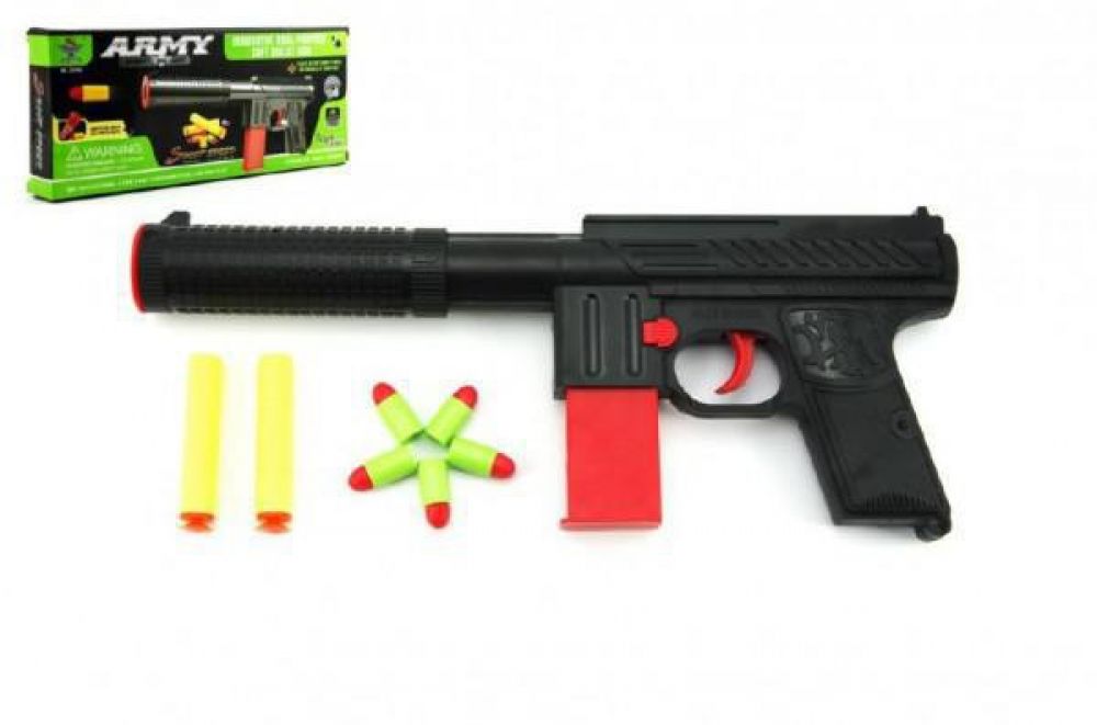 Pistole na pěnové nástroje o velikosti cca 30 cm. Pistole na pěnové nástroje o velikosti cca 30 cm.Sada obsahuje pistoli na pěnové náboje, 2 ks pěnových nábojů a špuntovku s 5 ks nábojů.Doporučený věk: 3+