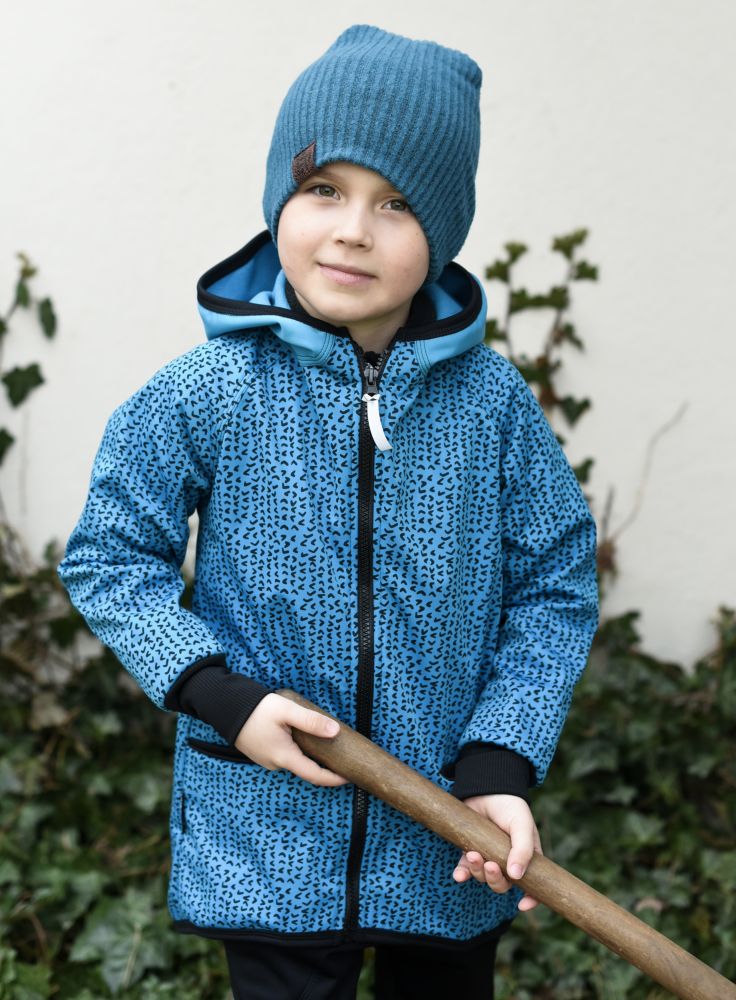 Dětská softshellová bunda.Softshell s kvalitní membránou - díky velmi příznivému poměru voděodolnosti a prodyšnosti (voděodolnost 18000mm/m2, prodyšnost 12000mm/m2/24hod) se bundička skvěle hodí do proměnlivého jarního či podzimního počasí.Osvědčený střih - prodloužený zadní díl krásně kryje zádíčka, náplety na rukávech zajistí, že rukávy dobře drží a nepadají. Nechybí ani kapsy a reflexní prvky.Neotřelý design - skvěle se kombinuje s jednobarevnými kalhotami a kšiltovkou ve stejném vzoru.