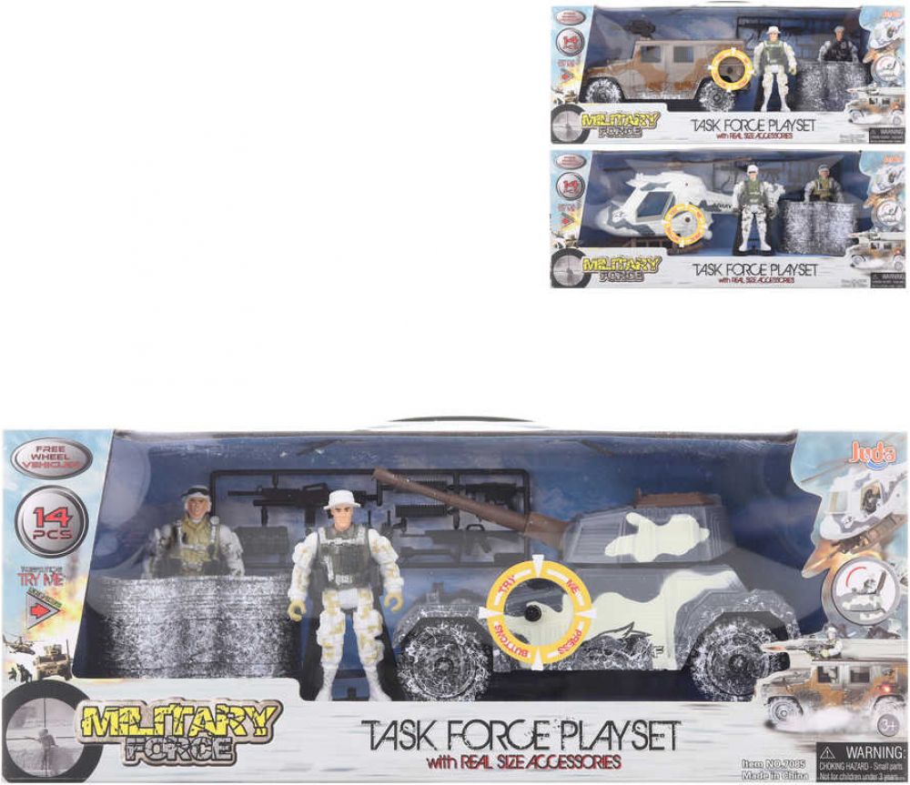 Vojenská sada na baterie, ve třech variantách provedení. Balení obsahuje helikoptéru, auto nebo dělo (tank) - dle varianty, 2 vojáky, úkryt a zbraně. Vojenské vozidlo / vrtulník vydává zvuky a svítí. Hračka na