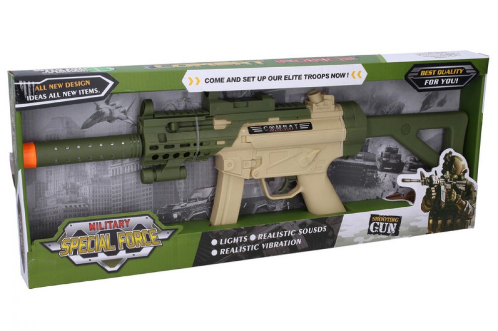 Chraň své území před nepřátelskou jednotkou! Se samopalem sejmeš každého nevítaného hosta! Realistické zvuky, vibrace a světelné efekty navodí tu správnou atmosféru a budeš si připadat jako v opravdovém boji! Velikost: 55 cm Doporučený věk: od 3 let Baterie 2xAA nejsou součástí balení.