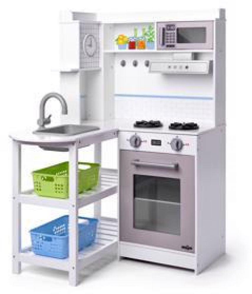 Kuchyňská linka se zvukovými a světelnými efekty. Po zatížení hrncem se plotýnka podsvítí červeným světlem a ozve se zvuk bublající vody. Po zmáčknutí tlačítka na digestoři se na jeho spodní straně rozsvítí světlo. Svým jednoduchým designem a bílou barvou se kuchyňka hodí do každého dětského pokojíku.Vlastnosti:- Věk: 3+